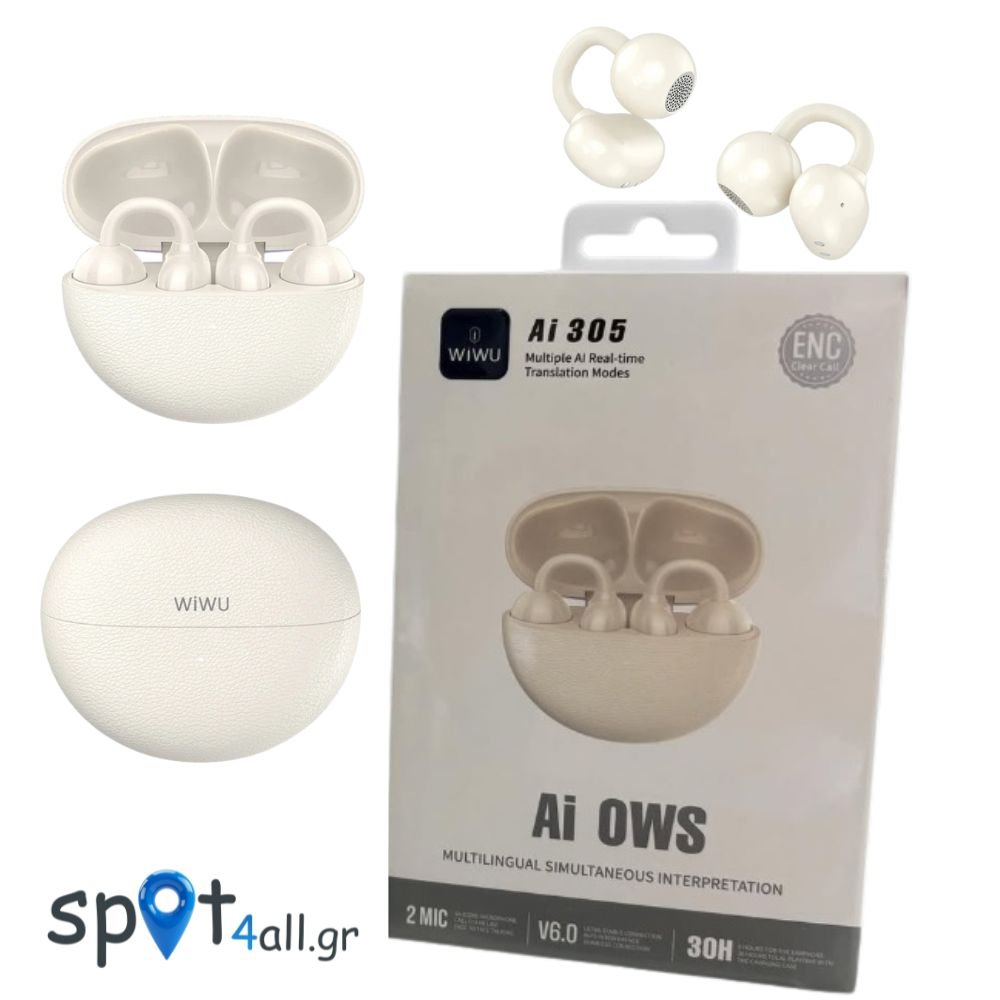 - Τα WiWU Ai305 είναι ασύρματα ακουστικά τύπου open-ear με εργονομικό ear-hook, σχεδιασμένα για άνεση και σταθερότητα σε πολύωρη χρήση. Η μεγάλη τους διαφοροποίηση είναι η λειτουργία real-time μετάφρασης, η οποία επιτρέπει την άμεση μετάφραση ομιλίας σε πολλές γλώσσες μέσω της ειδικής εφαρμογής Voxnex. Η εφαρμογή εγκαθίσταται εύκολα σκανάροντας το QR code που βρίσκεται στη συσκευασία.
