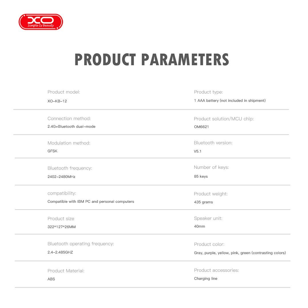 Το ασύρματο πληκτρολόγιο Bluetooth XO KB-12 διαθέτει συνδεσιμότητα διπλής λειτουργίας 2.4G ασύρματο & Bluetooth 5.1 για άνετη χρήση με πολλαπλές συσκευές. Ο compact σχεδιασμός με 85 πλήκτρα, το εντυπωσιακό τρίχρωμο φινίρισμα και η ελαφριά κατασκευή από ABS το καθιστούν κομψό και εύκολα φορητό. Απολαύστε μεγάλη διάρκεια μπαταρίας με έξυπνη λειτουργία αναμονής και ευρεία συμβατότητα με PC και laptop