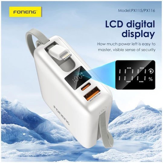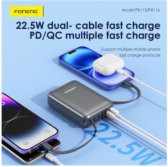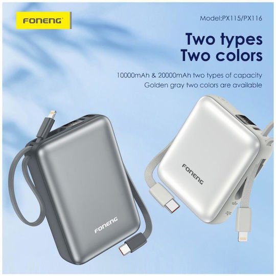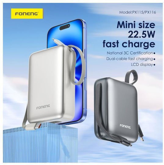 Power Bank Foneng PX115 Mini PD 22.5W 10000mAh με 2 Ενσωματωμένα Καλώδια Ασημί