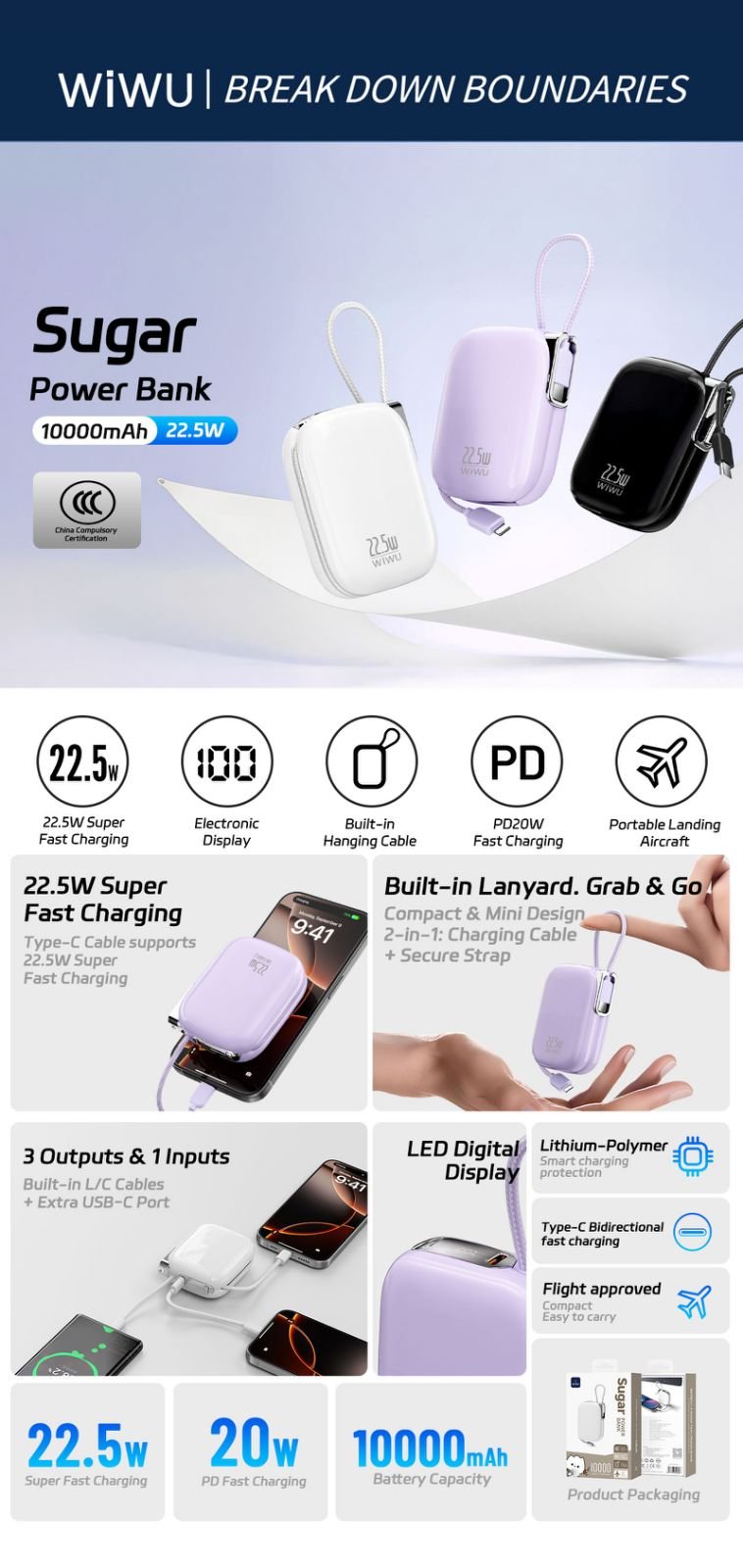 Διαθέτει ενσωματωμένο καλώδιο και λουράκι για εύκολη μεταφορά, ενώ η ισχύς έως 22.5W εξασφαλίζει γρήγορη φόρτιση όπου κι αν βρίσκεσαι. Η ψηφιακή οθόνη σου δίνει πλήρη έλεγχο της μπαταρίας, ώστε να μην ξεμείνεις ποτέ από ενέργεια.
