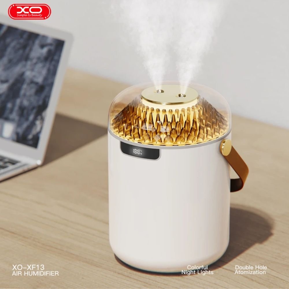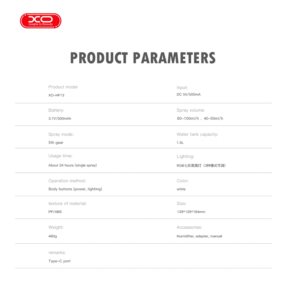 Υγραντήρας XO HF13 με λειτουργία ψεκασμού και χωρητικότητα δεξαμενής νερού 1.5L. Διαθέτει μπαταρία 400mAh που επιτρέπει έως 24 ώρες χρήσης. Ο υγραντήρας υποστηρίζει τρεις τρόπους ψεκασμού: μονός ψεκασμόςδιπλός ψεκασμός και εναλλασσόμενος ψεκασμός. Επιπλέον, προσφέρει RGB φωτισμό περιβάλλοντος με 7 χρώματα και 3 ρυθμιζόμενες λειτουργίες. Οι διαστάσεις του είναι 129 x 129 x 184mm και το βάρος του 460g. Ο υγραντήρας περιλαμβάνει αξεσουάρ όπως καλώδιο φόρτισης A σε C (50cm) και εγχειρίδιο.
